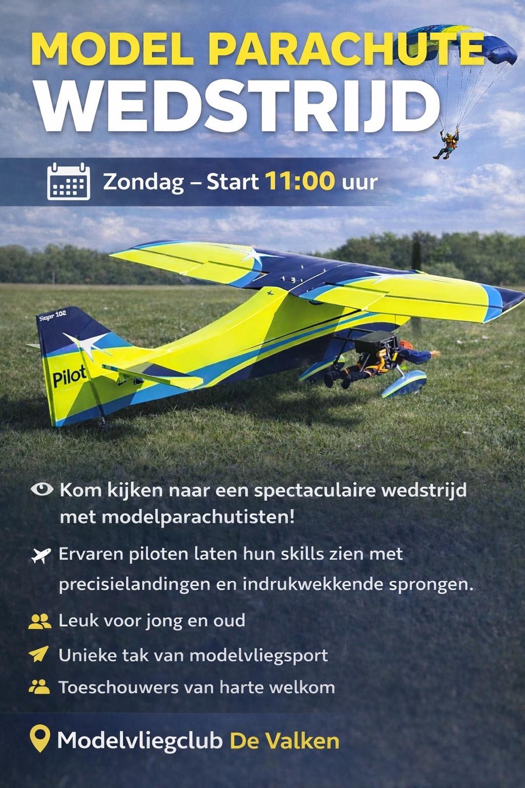 Demo RC Parachutes Stadskanaal 12 april 2026 zijn we te vinden in Stadskanaal voor een demonstratie met RC parachutes Tijdens deze demo laten we zien hoe precisie, techniek en plezier samenkomen in deze bijzondere tak van de modelvliegsport. Van gecontroleerde sprongen tot nauwkeurige landingen, en uitleg over hoe het allemaal werkt met zo’n para. Ben je nieuwsgierig hoe dit in zijn werk gaat, of wil je het eens van dichtbij zien? Je bent van harte welkom om te komen kijken en kennis te maken met onze vereniging en deze unieke hobby. We zijn te vinden bij modelvliegclub Stadskanaal Kijlsterweg 23 […]
